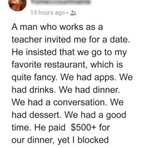 A woman blocked a man after their first date didn’t go as expected. She felt he violated her privacy and tested her financial capability. She posted her…
