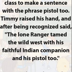 The teacher once asked the class to make a sentence with the phrase pistol too. Timmy raised his hand, and after being recognized said, “The lone Ranger…